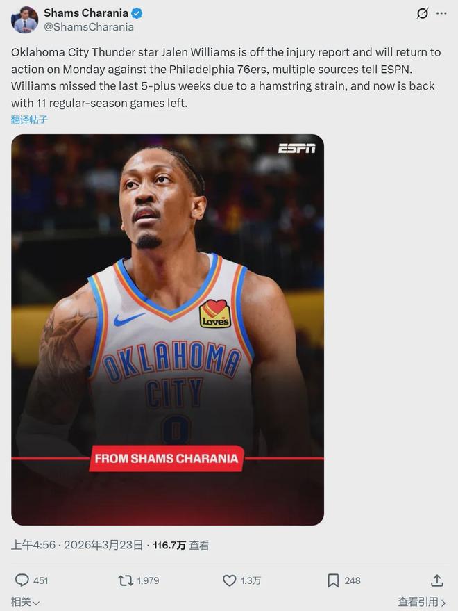 北京时间3月23日,据NBA名记Shams报道,雷霆二当家杰伦-威廉姆斯从伤病名单中移除,将于明天对阵费城76人的比赛中复出。杰伦-威廉姆斯此前遭遇腿筋拉伤,最近两个月只打了2场比赛。如今常规赛仅剩11场,他堪称压哨复出。