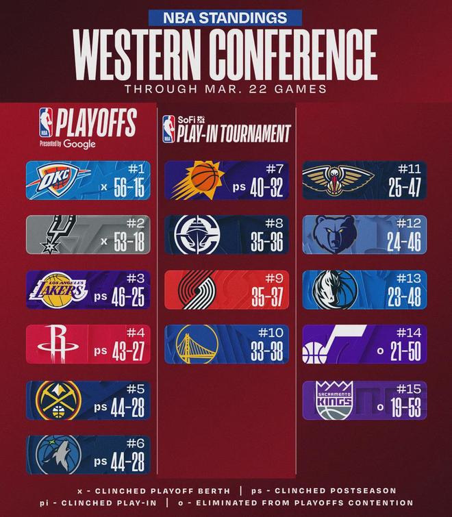 雷霆目前取得11连胜,56胜15负依然高居全联盟第一,领先马刺3个胜场。在二当家杰威长期缺阵的情况下,雷霆依然保住了联盟领头羊的位置。雷霆有资本让杰威继续休息,不过他需要利用常规赛找回状态,为季后赛做好准备。