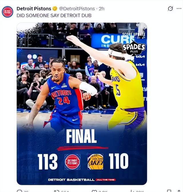 首先把剧情拉回比赛,活塞一度领先湖人多达16分,按理说这样的优势是稳赢的,但面对东契奇+詹姆斯坐镇的湖人,比赛自然不可能轻松结束。特别考虑到活塞主将坎宁安伤缺,在比赛进入下半场后,湖人开始反扑,甚至一度在第四节完成反超。
