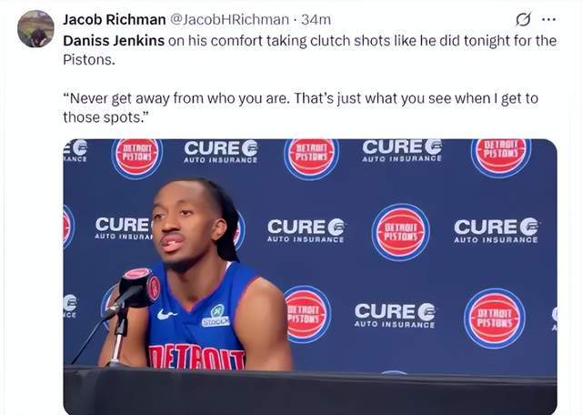 短短25秒时间里,詹金斯一人拿下关键6分,硬生生把比赛从湖人手中抢了回来。而反观湖人一方,最后12秒东契奇急停中投失手,最后一攻的绝平三分更是直接三不沾。对比两队关键时刻的表现,活塞取胜也就不难理解了。