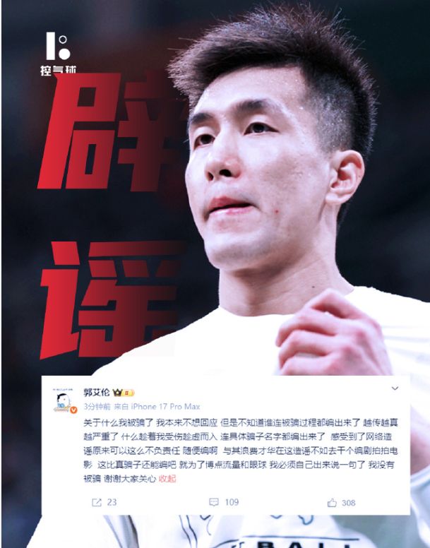 广州受伤球员郭艾伦回应诈骗事件:他表示自己没有被骗,都是外界编造的。