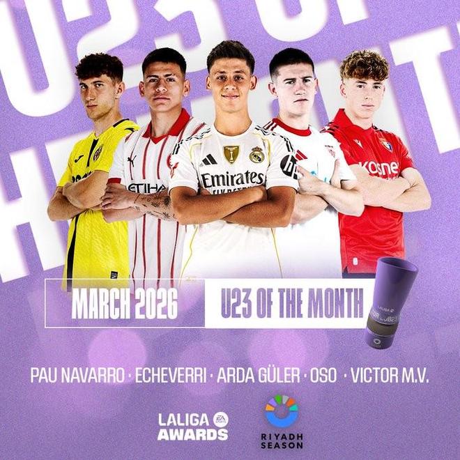 北京时间3月19日凌晨,西甲官方公布了3月份最佳U23球员的候选名单,其中居莱尔、埃切韦里、纳瓦罗、奥索、维克托-穆尼奥斯在列。