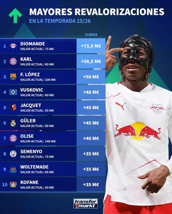 北京时间3月31日,德转列出了本赛季至今世界足坛身价涨幅最高的10名球员,RB莱比锡边锋扬-迪奥曼德暴涨7350万欧元位列第一,伦纳特-卡尔、费尔明-洛佩斯、居莱尔、奥利塞、塞门约以及沃尔特马德上榜。