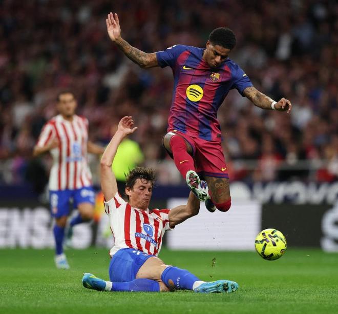 第35分钟巴萨前场打出精妙配合,亚马尔的巧射被立柱拒绝,逃过一劫的马竞,第39分钟率先取得进球,小西蒙尼接到朗格莱长传后,冷静推射建功,帮助马竞取得1-0的领先,不过仅仅过了3分钟,拉什福德就和队友打出撞墙配合,低射打穆索小门,将比分追至1平,半场结束前,冈萨雷斯防守端绊倒亚马尔,被主裁直接红牌罚下。